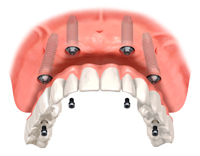 All-On-4 (オールオンフォー)という術式が有効です。オールオンフォーは 4 本ないし6本のインプラントを埋入し義歯で固定するという治療方法です。治療した即日に噛むことができ、普通の食事も可能です。